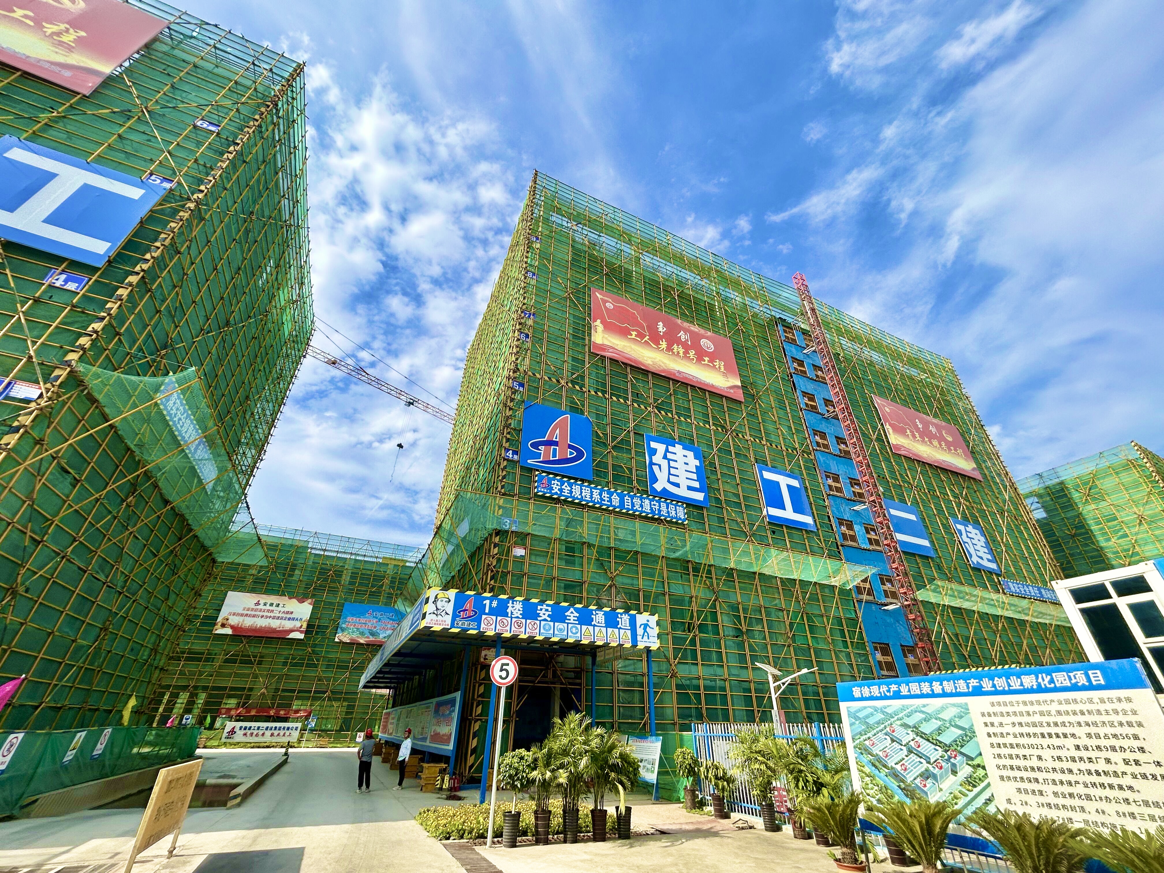 依托勞動競賽,項目部倒排工期、掛圖作戰(zhàn),加強現場人、機、料的投入,加大現場工作面建設。日前,宿徐產業(yè)園消防站及垃圾中轉站項目已竣工驗收;創(chuàng)業(yè)孵化園項目2#、3#樓主體驗收已完成;1#、4#、8#樓結構已封頂;5#、6#、7#樓正處于主體施工階段。其中,孵化園廠房更是連續(xù)通過了“宿州市建設工程施工質量標準化示范工程”“集團安全文明示范工地”以及“宿州市市級建筑施工安全生產標準化示范工地”的驗收。此外,在項目實施過程中,項目黨支部充分發(fā)揮黨組織的戰(zhàn)斗堡壘作用和黨員先鋒模范作用,順利通過驗收并被命名為建工集團“黨員先鋒號”工程。