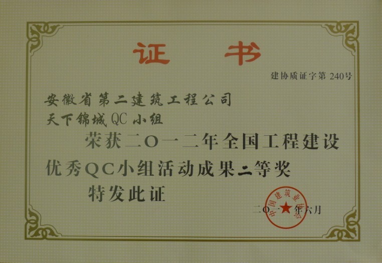 近日,從2012年度全國工程建設優(yōu)秀質量管理(QC)小組評審表彰會上傳來好消息,二公司質量技術處QC小組《提高外墻柔性面磚施工合格率》課題從眾多項目成果中脫穎而出,經國家工程建設質量獎審定委員會審定,榮獲中國建筑業(yè)協(xié)會工程建設質量管理分會“2012年度全國工程建設優(yōu)秀QC小組活動成果”二等獎,并獲頒優(yōu)秀成果證書及獎牌。該課題還榮獲安徽省建設工程優(yōu)秀QC小組一等獎。