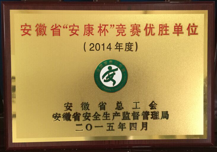 日前,在安徽省總工會和安徽省安全生產監(jiān)督管理局組織開展的以“廣泛發(fā)動提質量,文化引領強基礎”為主題的“安康杯”競賽活動評比中,我公司被授予2014年度安徽省“安康杯”競賽先進單位光榮稱號。