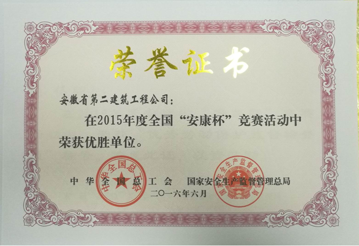 近日,安徽二建公司被評為2015年度全國“安康杯”競賽優(yōu)勝單位,并在日前召開的安徽省總工會“安康杯”競賽總結會上獲通報表彰。這是公司繼獲得2014年度安徽省“安康杯”競賽優(yōu)勝企業(yè)后再獲國家級榮譽。