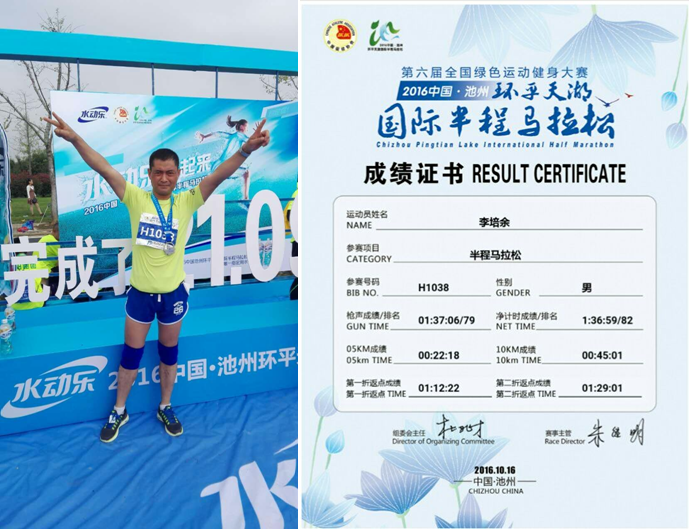 公司職工李培余在日前舉行的2016中國(guó)·池州環(huán)平天湖國(guó)際半程馬拉松比賽活動(dòng)中,以1:36:59秒的成績(jī)跑完21.0975km賽程,在6000多名參賽選手中排名82位,成績(jī)驕人。