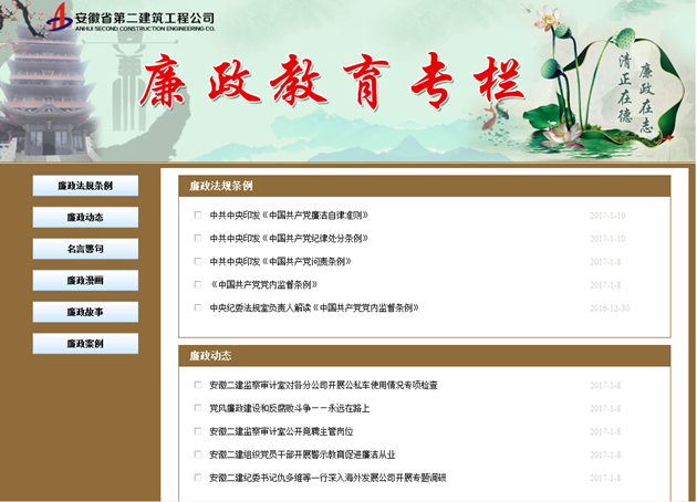 該專欄以公司網(wǎng)站為依托,設(shè)有廉政法規(guī)條例、廉政動態(tài)、名言警句、廉政漫畫、廉政故事、廉政案例六大板塊。通過廉政法規(guī)條例,轉(zhuǎn)載《中國共產(chǎn)黨廉潔自律準(zhǔn)則》、《中國共產(chǎn)黨紀(jì)律處分條例》、《中國共產(chǎn)黨問責(zé)條例》、《安徽省預(yù)防職務(wù)犯罪條例》等一系列黨紀(jì)黨規(guī)、國家法律法規(guī)知識,并在每一次修訂后及時更新,為廣大黨員干部學(xué)習(xí)使用提供方便。運用廉政動態(tài),及時發(fā)布集團(tuán)紀(jì)委和公司黨委、紀(jì)委通知要求,通報監(jiān)察審計事項與結(jié)果,做到監(jiān)督的公開化、透明化。以名言警句、廉政漫畫、廉政故事、廉政案例感染人、陶冶人,內(nèi)容直觀形象,用勤廉典型激勵人,深入剖析典型違紀(jì)案例,加強警示教育。