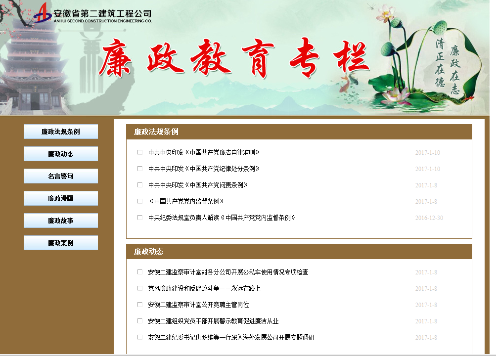 該專欄以公司網(wǎng)站為依托,設(shè)有廉政法規(guī)條例、廉政動(dòng)態(tài)、名言警句、廉政漫畫、廉政故事、廉政案例六大板塊。通過(guò)廉政法規(guī)條例,轉(zhuǎn)載《中國(guó)共產(chǎn)黨廉潔自律準(zhǔn)則》、《中國(guó)共產(chǎn)黨紀(jì)律處分條例》、《中國(guó)共產(chǎn)黨問(wèn)責(zé)條例》、《安徽省預(yù)防職務(wù)犯罪條例》等一系列黨紀(jì)黨規(guī)、國(guó)家法律法規(guī)知識(shí),并在每一次修訂后及時(shí)更新,為廣大黨員干部學(xué)習(xí)使用提供方便。運(yùn)用廉政動(dòng)態(tài),及時(shí)發(fā)布集團(tuán)紀(jì)委和公司黨委、紀(jì)委通知要求,通報(bào)監(jiān)察審計(jì)事項(xiàng)與結(jié)果,做到監(jiān)督的公開(kāi)化、透明化。以名言警句、廉政漫畫、廉政故事、廉政案例感染人、陶冶人,內(nèi)容直觀形象,用勤廉典型激勵(lì)人,深入剖析典型違紀(jì)案例,加強(qiáng)警示教育。