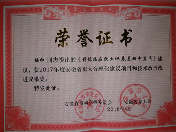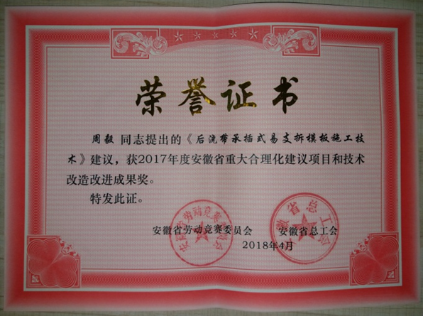 在日前召開的安徽省慶祝“五一”暨“當(dāng)好主人翁、建功新時(shí)代”勞動(dòng)競賽推進(jìn)大會(huì)上,對(duì)獲得榮譽(yù)稱號(hào)的先進(jìn)集體和先進(jìn)個(gè)人進(jìn)行了表彰頒獎(jiǎng)。我公司技術(shù)質(zhì)量部主任周毅提出的《后澆帶承插式易支拆模板施工技術(shù)》和副主任梅紅提出的《載體樁在軟土地基基礎(chǔ)中應(yīng)用》建議,雙雙榮獲2017年度安徽省重大合理化建議項(xiàng)目和技術(shù)改造改進(jìn)成果獎(jiǎng)。