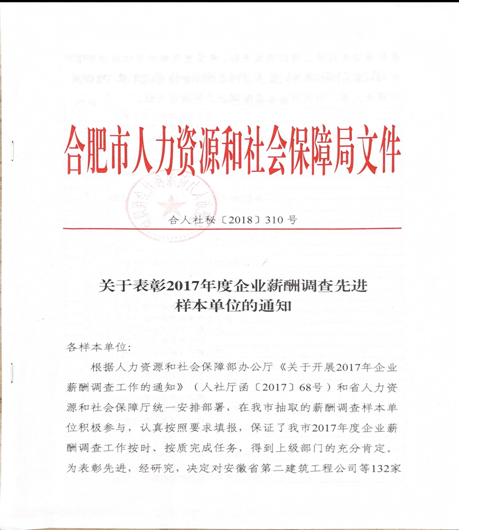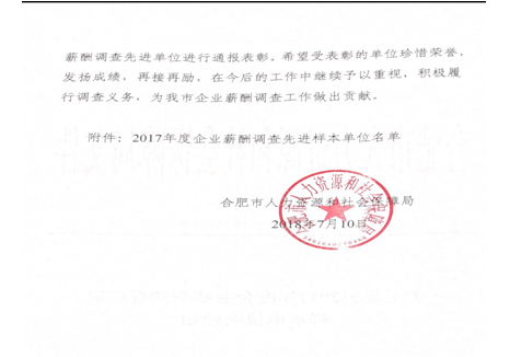 根據(jù)人力資源和社會(huì)保障部辦公廳《關(guān)于開(kāi)展2017年度企業(yè)薪酬調(diào)查先進(jìn)樣本單位的通知》(人社廳函【2017】68號(hào)),我公司領(lǐng)導(dǎo)高度重視,按照通知要求精心組織安排人員,以快速高效嚴(yán)謹(jǐn)?shù)墓ぷ鲬B(tài)度,圓滿完成了此次企業(yè)薪酬調(diào)查工作,得到了上級(jí)部門(mén)的充分肯定,榮獲了“2017年度企業(yè)薪酬調(diào)查先進(jìn)樣本單位”殊榮。