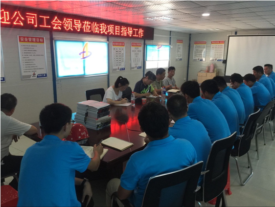 李主席一行到達施工現(xiàn)場,參觀了工地,仔細詢問了項目概況以及目前施工進度、質(zhì)量、安全等方面情況,聽取了項目工會主席創(chuàng)建“工人先鋒號”匯報,對項目班子以“一流工作、一流服務(wù)、一流業(yè)績、一流團隊”為目標的創(chuàng)建活動給予了肯定,鼓勵項目部繼續(xù)完善,爭創(chuàng)集團“工人先鋒號”工程。