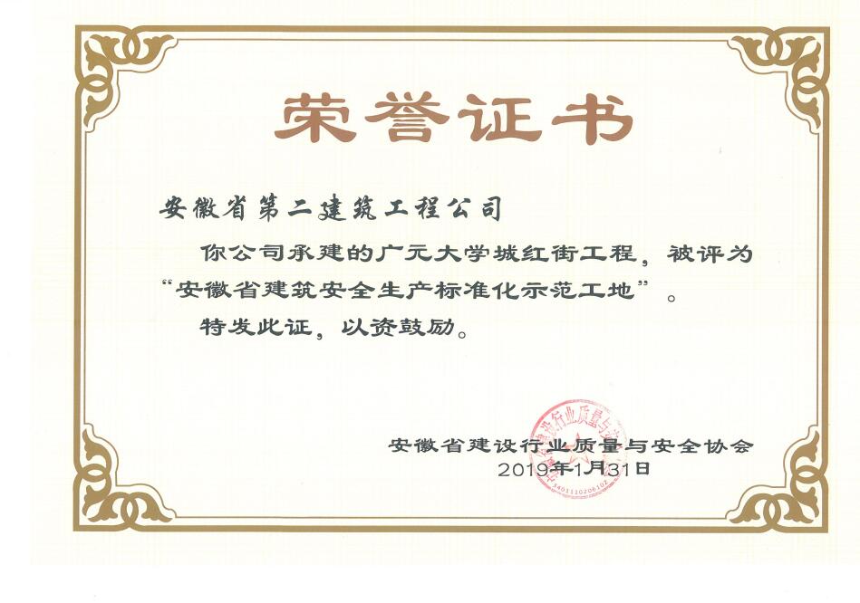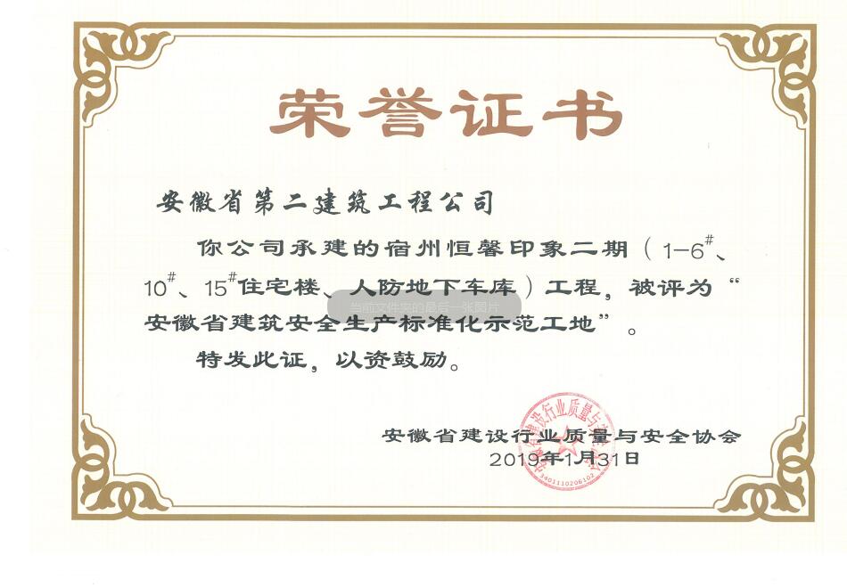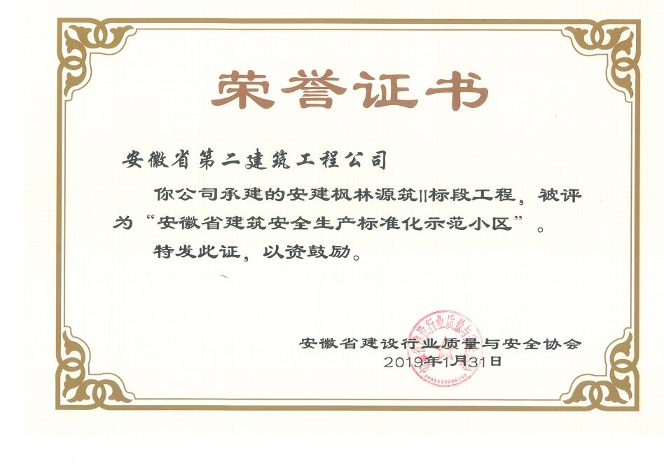 近日,從安徽省建設(shè)行業(yè)質(zhì)量與安全協(xié)會獲悉,安徽二建承建的肥西涼亭雅苑、阜陽楓林源筑、阜陽廣元大學(xué)城、宿州恒馨印象、淮北東岳雅苑5個項目獲得2018年度“安徽省建筑施工安全生產(chǎn)標(biāo)準(zhǔn)化示范工地”稱號,為公司再添榮譽(yù)。