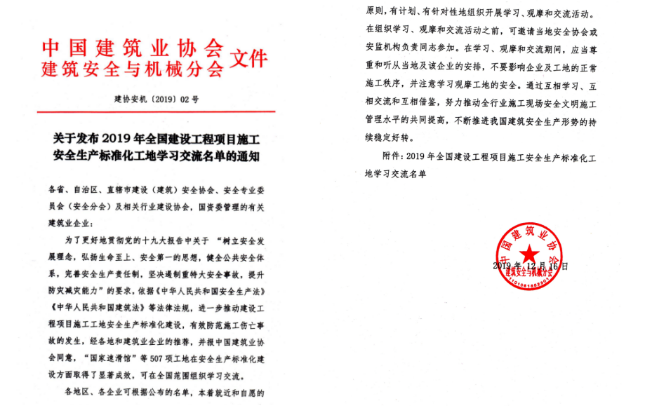 2019年,公司共創(chuàng)建全國建設工程項目施工安全生產(chǎn)標準化工地1個,省級安全生產(chǎn)標準化示范工地8個,市級安全生產(chǎn)標準化示范工地8個,集團公司安全文明標準化示范工地10個,創(chuàng)建項目數(shù)量再創(chuàng)歷史新高,突破了6年來國家級示范工地及省外項目省級示范工地零的突破。