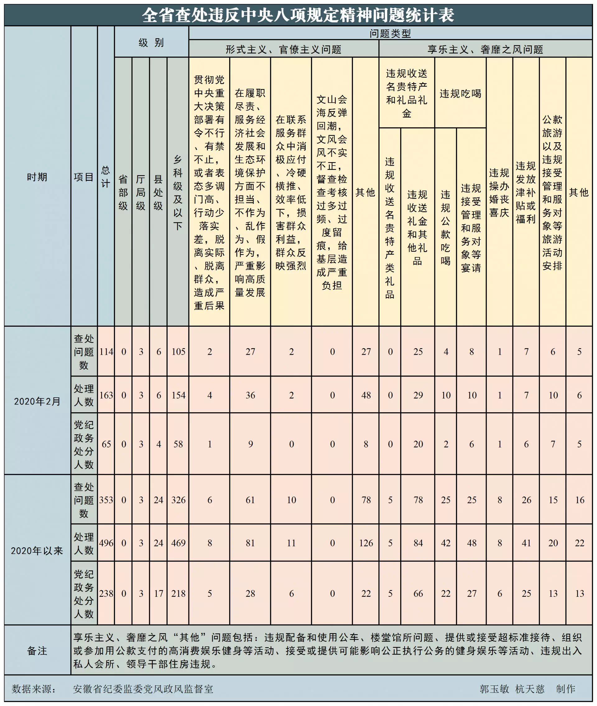 為掌握全省貫徹落實中央八項規(guī)定精神情況,安徽省紀(jì)委監(jiān)委在各省轄市和各省直機(jī)關(guān)、各省屬高校、各省屬企業(yè)建立了落實中央八項規(guī)定精神情況月報制度。2020年以來,截至2月29日,全省查處違反中央八項規(guī)定精神問題情況如下: