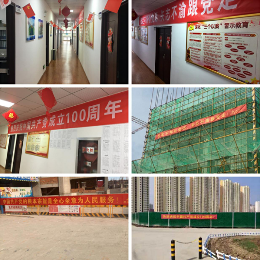 鑄就百年輝煌,書寫千秋偉業(yè)。為迎接中國共產(chǎn)黨成立100周年,六分公司機關(guān)及所屬項目部紛紛懸掛張貼了有關(guān)慶祝中國共產(chǎn)黨成立100周年的標語,營造濃厚的宣傳氛圍,把黨史學習教育進一步推向深入,大力營造“黨的盛典、人民的節(jié)日”濃厚氛圍,充分展示中國共產(chǎn)黨百年光輝歷程、偉大成就和寶貴經(jīng)驗,全面營造濃厚氛圍, 共慶黨的百年華誕,大力唱響共產(chǎn)黨好、社會主義好,改革開放好、偉大祖國好、各族人民好的時代主旋律。