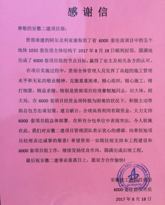 康斯坦丁6000套工程項目是由安徽建工集團獨立總承包的項目,安徽二建公司承擔(dān)1032套施工任務(wù),建筑面積10萬平米,合同額2.5億人民幣,此次結(jié)構(gòu)封頂?shù)氖瞧渲形鍌€地塊1032套住房。項目部在施工過程中,克服重重困難,科學(xué)制定施工方案,合理調(diào)配人員設(shè)備,精心組織,精細(xì)施工,抓管控保優(yōu)質(zhì),始終秉持“建精品、創(chuàng)一流”的建設(shè)目標(biāo),將工程質(zhì)量放在第一位。在項目部全體參建員工的努力下,康斯坦丁6000套項目的建設(shè)獲得了業(yè)主及相關(guān)各方的好評。安徽建工駐阿經(jīng)理部6000套項目組在感謝信中充分肯定了項目部的建設(shè)成果,高度贊揚安徽二建項目部高效的管理水平和無私的敬業(yè)精神,并特別對安徽二建項目經(jīng)理章恒旭同志識大體、顧大局的工作作風(fēng)以及積極主動、建言獻(xiàn)策的工作態(tài)度表示感謝。在信的結(jié)尾,6000套項目組對今后的合作也提出了期許,希望能夠攜手并進(jìn),共創(chuàng)未來。