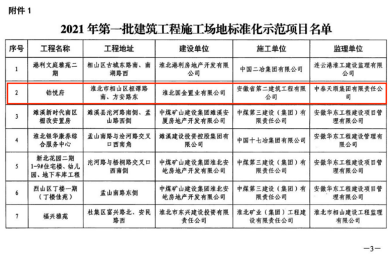 11月2日,淮北市住房和城鄉(xiāng)建設(shè)局、淮北市生態(tài)環(huán)境局公布了第一批淮北市“建筑工程施工場地標(biāo)準(zhǔn)化示范項目”名單,安徽二建第一分公司淮北鉑悅府項目在考核評價過程中,達(dá)到優(yōu)良等級,被評為2021年淮北市第一批建筑工程施工場地標(biāo)準(zhǔn)化示范項目。