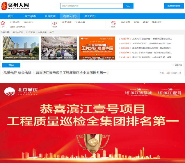 近日,安徽二建第四分公司亳州濱江壹號項目在北京城房集團(tuán)6個城市40個精品工程質(zhì)量巡檢中脫穎而出,喜獲第一名。