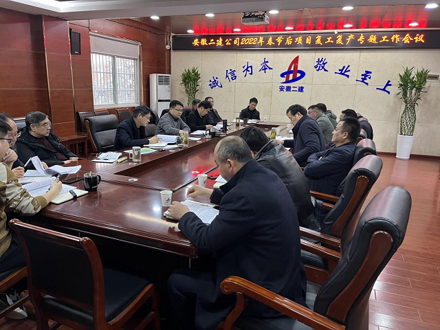 2月16日下午,安徽二建公司在一樓會(huì)議室召開(kāi)了節(jié)后項(xiàng)目復(fù)工復(fù)產(chǎn)專題工作會(huì)議。公司總經(jīng)理李建成、財(cái)務(wù)總監(jiān)王干出席會(huì)議,會(huì)議由副總經(jīng)理葉和永主持。公司工程管理部、法務(wù)部(債權(quán)回收辦)、財(cái)務(wù)資產(chǎn)部、物資設(shè)備部、成本合約部、安全管理部、技術(shù)質(zhì)量部負(fù)責(zé)人、所屬各單位經(jīng)理、生產(chǎn)副經(jīng)理參會(huì)。